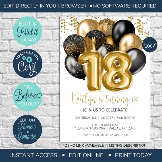 Editable 18th Birthday Invitation Black And Gold 18th Etsy